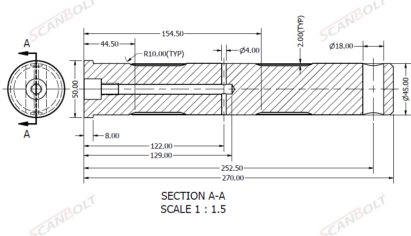 Robust hærdet stålbolt/aksel i høj kvalitet, velegnet til entreprenørmaskiner og andre krævende opgaver, hvor der stilles store krav til styrke og holdbarhed. Bolten er fremstillet i hærdet stål, hvilket giver en slidstærk overflade og lang levetid – også under hård belastning.